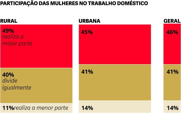 das entrevistadas são as únicas responsáveis pelo trabalho doméstico não remunerado, enquanto pouco mais da metade compartilha essa responsabilidade. entre as mulheres rurais, a participação no trabalho doméstico é maior