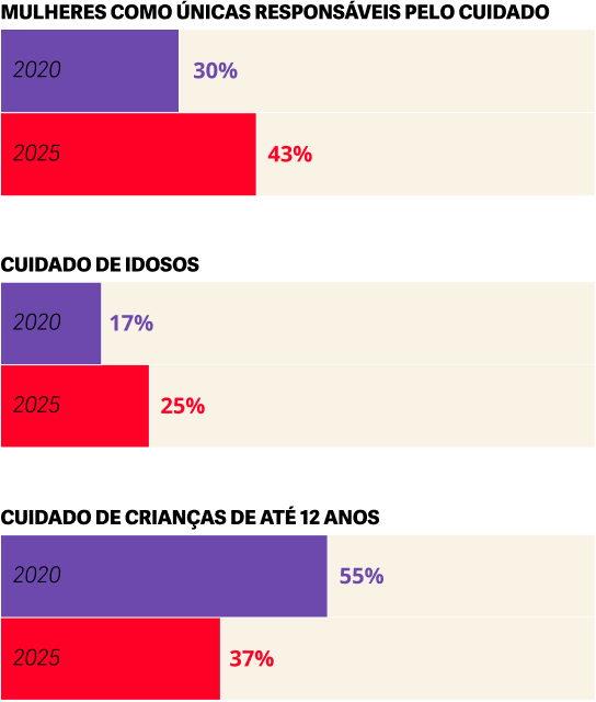 das mulheres são as únicas responsáveis pelo cuidado em 2025. Em 2020 eram 30%.